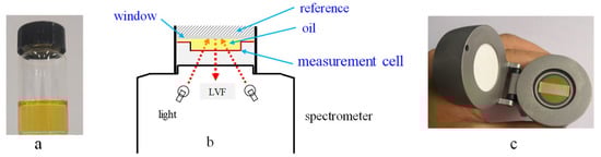 MicroNIR 1700 handheld spectrometer with a liquid-sample accessory for measuring oil samples (a), schematic diagram of the measurement (b), and the liquid-sample accessory (c). Reproduced (CC-BY 4.0 license) from [].