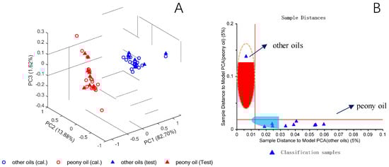 3D-PCA score plot for the calibration samples (open symbols) and test set samples (closed symbols) of peony seed oil and other oil species (A) and Coomans plot for the spectra of test samples of peony seed oil and other oil species (B). Reproduced (CC-BY 4.0 license) from [].