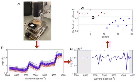The whole analysis process, experimental set-up of hazelnut-powder measurement (A), spectral processing (B,C), and PLS-DA results (red: 2021 crop, blue: 2022 crop) (D).