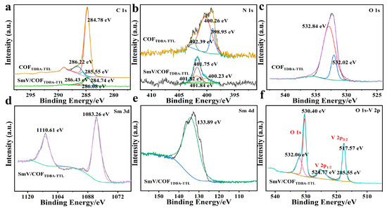 XPS fine map of COFTDBA-TTL and SmV/COFTDBA-TTL: (a) C 1s; (b) N 1s; (c) O 1s; (d) Sm 3d; (e) Sm 4d; (f) O 1s-V 2p.