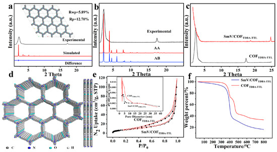 (a) XRD pattern and AA-stacked model; (b) Experimental (black) XRD and simulated XRD patterns for AA structure (red) and AB structure (blue) of COFTDBA-TTL; (c) XRD comparison of COFTDBA-TTL and SmV/COFTDBA-TTL; (d) Eclipsed conformations and π–π accumulation distance between two adjacent layers of COFTDBA-TTL; (e) N2 adsorption and desorption curve of COFTDBA-TTL and SmV/COFTDBA-TTL, and inset was pore size distribution of COFTDBA-TTL and SmV/COFTDBA-TTL; (f) TGA images of COFTDBA-TTL and SmV/COFTDBA-TTL.