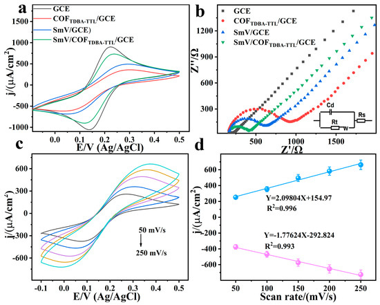 To enable the electrochemical performance of the modified electrode to be demonstrated, cyclic voltammetry (CV) and electrochemical impedance spectroscopy (EIS) of different modified electrodes were tested in electrolytes containing 5.00 mM [Fe(CN)6]3−/4− and 0.100 M KCl, respectively (Figure 8a,b) [45,46]. It was found that the peak current of COFTDBA-TTL/GCE was reduced when compared to that of the GCE, but the redox peak still remained, with a slight increase in the peak-to-peak potential difference. EIS showed that the corresponding impedance also increased slightly, indicating that the COF was successfully modified on the GCE surface, leading to the delay of charge transfer. However, with the introduction of rare earth metals, the peak current of the SmV/COFTDBA-TTL/GCE modified electrode increased, and the corresponding impedance also decreased slightly. This indicated that the interfacial synergy formed by the combination of SmV/COFTDBA-TTL on the GCE simplified the charge transfer kinetics of the redox couple, causing the SmV/COFTDBA-TTL/GCE modified electrodes to have higher electrocatalytic activity and good electronic conductivity. In addition, the introduction of COF increased the specific surface area of the electrode, and abundant C=C and C=N functional groups offered a large number of active sites, which can further accelerate the electron transfer. Next, the CVs of the SmV/COFTDBA-TTL/GCE modified electrode were tested at different scan rates (50.0–250 mV/s) (Figure 8c) [47,48,49]. The redox peak of the SmV/COFTDBA-TTL/GCE modified electrode was positively correlated with the scan rate, which means that the redox reaction was a typical surface adsorption-controlled process (Figure 8d).