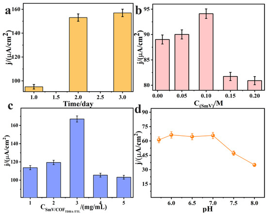 (a) Comparison of electrochemical properties of COFTDBA-TT synthesized at different time (one day, two days, three days) to SFZ; (b) Optimization of different SmV (0.0100 M, 0.0500 M, 0.100 M, 0.150 M, 0.200 M) modification amount; (c) The optimization of different modification amount, adding 1 mg/mL, 2 mg/mL, 3 mg/mL, 4 mg/mL, 5 mg/mL SmV/COFTDBA-TTL, respectively; (d) The current response of the SmV/COFTDBA-TTL/GCE-modified electrode to SFZ was compared in the range of pH 5.8–8.0. The electrolyte was PB (5.00 mM, pH = 7.0), containing 5.00 μM SFZ. SWV was used to monitor the effects current response of SFZ.
