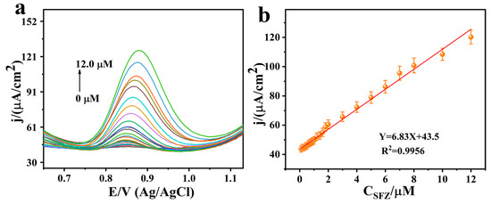 (a) SWV of SmV/COFTDBA-TTL/GCE modified electrode with continuous addition of SFZ; (b) Linear relationship; the electrolyte was PB (5.00 mM, pH = 7.0), and the added SFZ concentration is 0–12.0 μM.