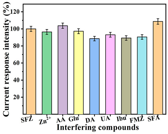 The repeatability and stability of the SmV/COFTDBA-TTL/GCE-modified electrode were very important. The electrode was left at ambient temperature for 30 days, and its current response to SFZ was found to be well maintained, which means that the electrochemical sensor constructed by SmV/COFTDBA-TTL/GCE has good stability (Figure 11a and Figure S7a, Support Information) [56,57]. To verify the reproducibility of the SmV/COFTDBA-TTL/GCE-modified electrode, we used five parallel electrodes under the same experimental conditions. After calculation, the RSD was 3.60%, indicating that the SmV/COFTDBA-TTL/GCE modified electrode presented good reproducibility (Figure 11b and Figure S7, Support Information). Furthermore, identifying the potential interferers is critical to determine sensor reliability (Figure 12). In PB solution (5.00 mM, pH = 7.0) containing 5.00 μM SFZ, we added metal ions (zinc ions, Zn2+), biomolecules ((ascorbic acid, AA), uric acid (UA), dopamine (DA), glucose (Glu)), and other antibiotic drugs (ibuprofen (Ibu), flumethazol (FMZ), and sulfisoxazole (SFA)) fifty times. The anti-interference ability showed that, after adding interfering substances, the relative standard deviation (RSD) of SmV/COFTDBA-TTL/GCE for SFZ detection ranged from 88.6% to 108%, indicating that it has high selectivity [58]. The excellent selectivity of the SmV/COFTDBA-TTL/GCE modified electrode for SFZ detection may be attributed to the synergistic effect produced by the combination of SmV and COFTDBA-TTL, which may lead to more active surface area, accelerate the charge transfer kinetics, and generate more surface active sites. In addition, the surface electron rate can be regulated by increasing the defect degree in the nanocomposite, and then the active edge sites are enriched, thereby improving the selectivity of the sensor.
