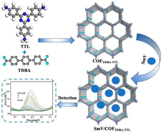 Covalent organic framework materials (COFs) have been used as electrode materials for sensing analysts in recent years due to their unique physicochemical properties (controllable pore size and structure, large specific surface area, versatile functions, and stability) [22]. For instance, Pang et al. achieved the detection of bisphenol A and bisphenol S by synthesizing COF and CTpPa-2 [23]. Wu et al. achieved the detection of riboflavin by synthesizing COFTFPB-Thi [24]. COF/Pt/MWCNT-COOH nanocomposites were synthesized by Feng et al. to achieve sensitive detection of dopamine [25]. However, due to the poor insolubility and conductivity of porous polymers, it is difficult to connect them directly with electrodes, which greatly limits the practical application of COFs in electrochemistry. To effectively combine COF postmodification or modification on different substrates (GO [26], carbon nanotubes uses (CNT) [27], SiO2 [28]) have been attempted by scientists to overcome this defect. However, the selection of substrate and harsh growth conditions make COFs difficult to synthesize. In addition, the uniformity of COFs on the substrate is difficult to control. The nanostructure of rare earth mixed metal oxide samarium vanadate (SmV) has many advantages, such as valence states, abundant oxygen vacancies, excellent electrochemical activity, and electroactive sites [29,30]. For example, Gallis et al. prepared a rare earth metal–organic skeleton to realize acid gas adsorption and optical detection [31]; Ma et al. synthesized composite materials with luminescent response using rare earth metal–organic skeleton covalent linked microsphere resins [32]. Therefore, the inclusion of SmV in COFs is expected to solve the anneal problem, and there are few reports about it.