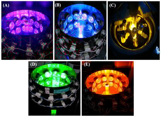 Add 0.066 g of trisodium citrate powder to a beaker containing 49.5 mL of Milli-Q grade water and stir with a magnetic stir bar. Then, add 0.5 mL of silver nitrate solution (10−2 M) to the beaker and stir for 5 min. After that, transfer the solution from the beaker into a glass tube and irradiate it with violet LEDs (405 ± 10 nm, 35 mW/cm2, as shown in Figure 1A) for 70 s. The solution turned yellow within 45 s, indicating the formation of spherical AgNPs. Then the photochemical seed AgNP colloids were irradiated with blue LEDs (460 ± 12 nm, 40 mW/cm2, as shown in Figure 1B) for 90 min. The end products exhibited a fascinating bicolor characteristic, reflecting shades of orange and green when viewed from various angles [28], as illustrated in Figure 2. This intriguing optical property is attributed to the intense light scattering by the product’s unique structure [29,30].