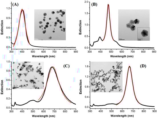 Figure 3A–D depicts the UV-vis spectra and TEM images of colloidal silver nanoparticles with different shapes. Quasi-spherical silver nanoparticles (QS-AgNPs), shown in Figure 3A, exhibit an asymmetric LSPR band that peaked at around 400 nm with an FWHM of about 80 nm. The size distribution ranges from 5–20 nm. Figure 3B shows decahedral silver nanoparticles (D-AgNPs), which exhibit a highly symmetrical and sharp LSPR band centered around 475 nm, corresponding to the long-axis (in-plane) dipolar LSPR mode. Additionally, a minor band centered around 400 nm corresponds to the short-axis (out-of-plane) dipolar LSPR mode. The as-prepared D-AgNPs have a narrow size distribution with an edge length of 40 ± 5 nm. Triangular silver nanoplates (T-AgNPts) shown in Figure 3C were synthesized using a plasmon-mediated process under sodium lamp irradiation. The UV-vis spectra of T-AgNPts show bands peaking at 690 nm and 332 nm correlating to the in-plane dipolar LSPR mode and out-of-plane quadrupole mode, respectively. The primary band at 690 nm is not symmetrical, and the TEM image shows a broad size distribution. Figure 3D shows silver nanoplates synthesized through a three-stage photochemical reaction, which exhibit two LSPR bands peaked at 675 nm and 333 nm. These bands correspond to the in-plane dipolar LSPR and out-of-plane quadrupole modes. The in-plane dipolar LSPR band is sharp, symmetrical, and can be fitted with a Lorentzian function with an FWHM of 72 nm. The size distribution of these silver nanoplates is 60 ± 15 nm. Due to their high quality, we refer to the silver nanoplates synthesized through the three-stage photochemical reaction as HQ-AgNPts.