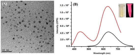 Figure 4A,B depicts the TEM images, fluorescence spectra, and the digital image of BSA-protected gold nanoclusters (BSA-Au NCs). The TEM image shown in Figure 4A indicates that the BSA-Au NCs exhibit a narrow size distribution, with sizes ranging from 0.5–2.5 nm. This confirms the success of the synthesis method used in this study. Figure 4B illustrates the fluorescence spectra of BSA-Au NC colloids excited at 370 nm and 480 nm. The fluorescence spectrum excited at 480 nm shows only one peak, while the spectrum excited at 370 nm displays two peaks. The peak observed at 640 nm in both spectra corresponds to the fluorescence bands of Au25 NCs [8]. However, the peak at 440 nm, observed only in the spectrum excited at 370 nm and having an intensity of only one-third of the peak at 640 nm, is likely due to fluorescence from BSA aggregation, as shown in Figure S1. Further investigation would be required to confirm this hypothesis.
