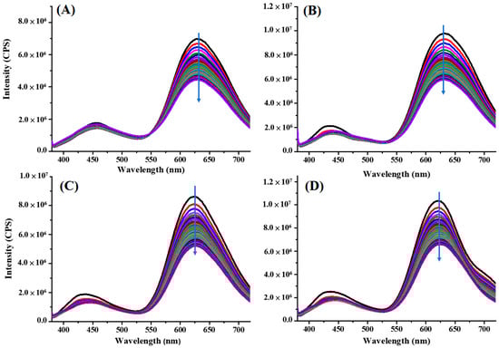 Fluorescence spectra of BSA-Au NCs in the presence of (A) QS-AgNP colloids, (B) D-AgNP colloids, (C) T-AgNPt colloids, and (D) HQ-AgNPt colloids at various interaction times under 370 nm light excitation.