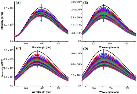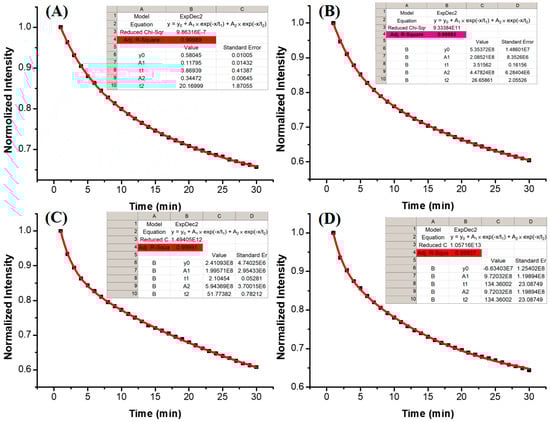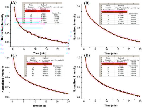 Figure 9A–D displays the changes in fluorescence intensity integration of BSA-Au NCs (the area under the spectra between 550–720 nm) as a function of interaction time. The red lines in the figures correspond to the bi-exponential decay function that fits with all R2 values above 0.996. The fitted parameters are listed in Table 2.