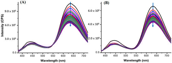 In previous studies, the effect of silver ions on the fluorescence behavior of Au NCs was reported. For instance, Jin’s group demonstrated that glutathione-protected gold nanoclusters (Au25SG18) showed increased fluorescence intensity in the presence of silver ions [38]. They proposed a principle based on the change in the oxidation state of Au NCs and silver ions to explain this phenomenon of fluorescent enhancement. On the other hand, Chang’s group reported that Ag+ ions can suppress the fluorescence of Au NCs on aluminum oxide (Al2O3) nanoparticles through the d10–d10 electron interaction between Ag and Au [39]. Similarly, Wang et al. showed that the fluorescence of cytidine-stabilized Au NCs could be turned on in the presence of silver ions by forming AuAg NCs [40]. Since free silver ions can play diverse roles in affecting the fluorescence response of Au NCs and cannot be entirely excluded in the AgNP colloids [41], it is essential to estimate their influence. In this regard, Figure 7A,B illustrates the fluorescence evolution of BSA-Au NCs in the presence of 10−4 M and 2.5 × 10−6 M silver ions. The results indicate that as the concentration of silver ions increases, the fluorescence decays more rapidly. However, it is noteworthy that even at a low concentration of silver ions, the fluorescence of BSA-Au NCs still decreases over time. This observation may be attributed to the inherent photo-instability of BSA-Au NCs when exposed to continuous excitation of UV light (370 nm) emitted from the fluorescent spectrometer lamp.