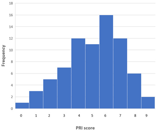 A frequency diagram showing the overall PRI scores for the 75 articles of the test case.
