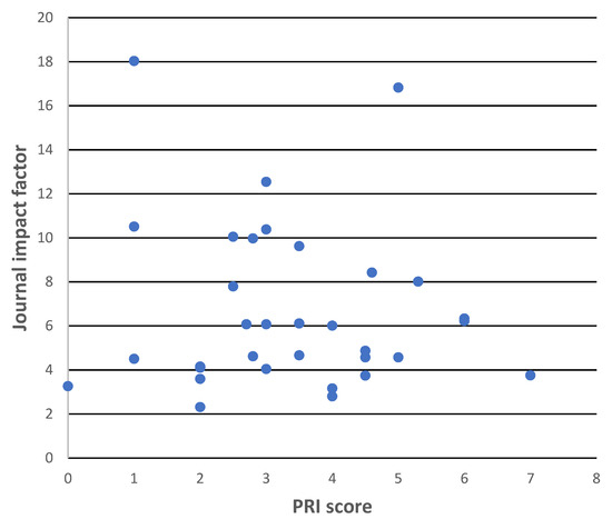 To test for a possible relationship between the good reporting of staining protocol factors and journal quality, the following procedure was carried out. The mean PRI score of papers published in each of the 34 journals contributing to the 75-article dataset were calculated. A scatter plot was made of these scores versus the corresponding journal impact factors (obtained from Journal Citation Reports), see Figure 2. An inspection of this figure indicates that there is no trend to higher PRI values (i.e., to better reporting) at higher journal impact factors. Consequently, basing a search for novel probes on journal quality, so defined, would not help a biologist seeking well-documented novel probes.