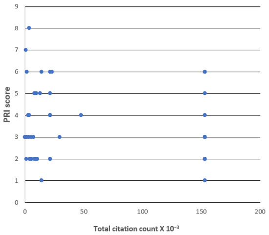Scatter plot of overall PRI scores vs. total citation count of most-cited corresponding author for the 75 articles of the LD test case.
