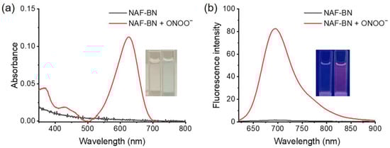 Absorption (a) and fluorescence spectra (b) of NAF-BN (5 μM) before (black line) or after (red line) reaction with ONOO− (100 μM) for 15 min in phosphate buffer (100 mM PB, pH 7.4, with 50% of DMSO). λex = 600 nm; slits = 5 nm/5 nm. Inset: change in solution before and after the reaction of the NAF-BN with ONOO− under daylight or UV lamp (365 nm).