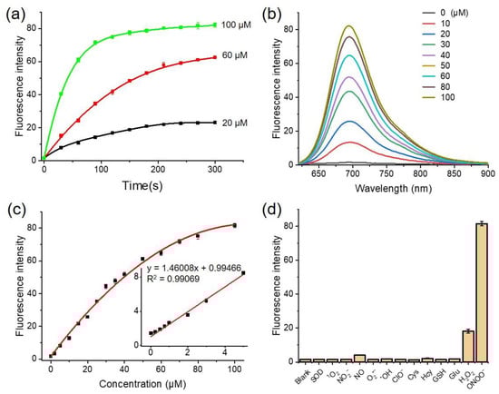 The sensitivity and quantitative detection ability of a probe are crucial factors for its utility in biological systems. Therefore, in this study we investigated the sensitivity of NAF-BN to ONOO− through titration experiments. As shown in the figure (Figure 2b), the fluorescence emission gradually increased with the increasing concentrations of ONOO−. A linear relationship was observed between the concentrations of ONOO− and the fluorescence emission intensity at 695 nm in the range of 0–5 μM, indicating that NAF-BN can achieve effective detection of ONOO− in this concentration range (Figure 2c). The calculated limit of detection (LOD) of the probe NAF-BN was found to be 436 nM, which is in the physiological concentration range of ONOO− []. This implies that the probe can potentially be used to monitor endogenous ONOO− levels in biological systems.