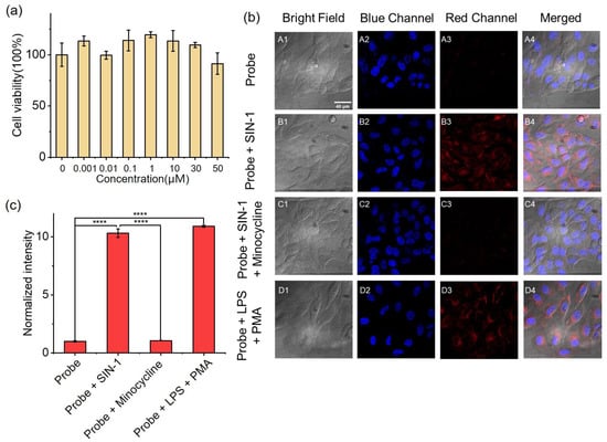 SIN-1, a well-known generator for ONOO−, was used to provide exogenous ONOO−, and the ONOO− was removed by minocycline [,]. Phorbol-12-myristate 13-acetate (PMA) and lipopolysaccharide (LPS) was used to stimulate endogenous ONOO− production in cells. It has been demonstrated that PMA can activate potential NADPH oxidase (NOX) to produce O2− and LPS can stimulate NO synthase (iNOS) to produce NO, which together induce the overexpression of ONOO− [,]. The experimental methods and procedures refer to the studies [,,,,,,,,,]. The probes are prepared with DMSO as a 5 mM stock solution and then diluted to 10 μM using cell culture medium (DMSO = 0.2%). Each time the medium is changed, the medium from the previous step is cleaned up. Four groups of cells were prepared for imaging using NAF-BN (10 μM). The first group was incubated with NAF-BN (10 μM) for 30 min, rinsed with PBS three times, and imaged. The second group was pretreated with NAF-BN (10 μM) for 30 min, then incubated with SIN-1 (100 μM, peroxynitrite donor) for 1 h, rinsed three times with PBS, and imaged. The third group was pretreated with NAF-BN (10 μM) and minocycline (100 μM; ROS scavenger) for 30 min, then incubated with SIN-1 (100 μM) for 1 h, washed three times with PBS, and imaged. The fourth group was incubated with NAF-BN (10 μM) for 30 min, then incubated with PMA (50 μM) and LPS (50 μM) for 4 h, washed three times with PBS, and imaged. In addition, cell nuclei were stained with DAPI for 30 min, washed with PBS, and imaged. Confocal shooting: DAPI was acquired using an excitation wavelength of 405 nm and an emission wavelength range of 410–450 nm (blue channel). Probe fluorescence imaging was acquired using an excitation wavelength of 600 nm and an emission wavelength of 690 nm (red channel).