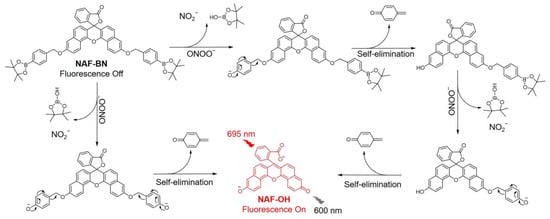 Boronates are emerging as one of the most effective identification groups for detecting and quantifying hydrogen peroxide and peroxynitrite and were often used to develop hydrogen peroxide and peroxynitrite fluorescent probes previously [,,,,,,,,,,]. Herein, we present a NIR fluorescent probe for ONOO− detection, namely NAF-BN, that is based on a naphthalene fluorescein scaffold and contains a benzyl boronic acid ester recognition group. The naphthalene fluorophores of the probe have a polycyclic conjugated structure, which provides excellent NIR fluorescence quantum yields and chemical stability. The boronic ester moiety was chosen over the boronic acid in an attempt to increase lipophilicity and therefore cell permeability []. In addition, boronic ester–benzyl ether linkage indicated superior aqueous stability [] and substituted phenylboronates have a greater reaction rate constant for peroxynitrite than aliphatic boronates at pH 7.4 []. The sensing mechanism of the probe involves ONOO−-induced oxidation and hydrolysis of the boronic acid ester (Scheme 1), which triggers the isomerization of the lactone spiro ring of the probe and results in a fluorescence “off-on” effect with short response times. NAF-BN has been successfully used to visualize ONOO− levels in living cells. Additionally, NAF-BN has exhibited potential in verifying the hypothesis that the neonicotinoid pesticide imidacloprid induces brain neural damage and increases oxidative stress in a Drosophila model.