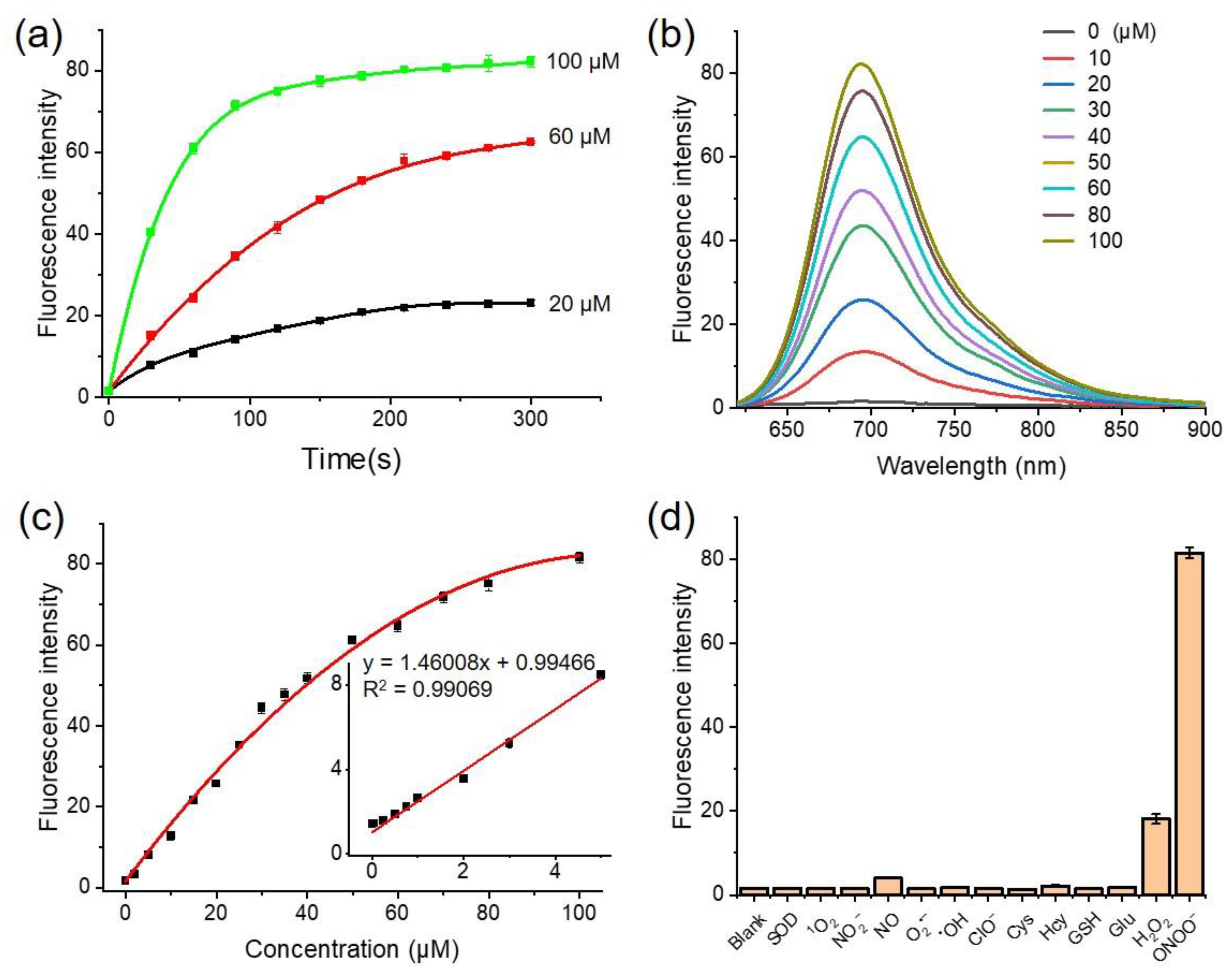 - Yuan, R.Q.; Ma, Y.H.; Du, J.Y.; Meng, F.X.; Guo, J.J.; Hong, M.; Yue, Q.L.; Li, X.; Li, C.Z. A Novel Highly Selective near-Infrared and Naked-Eye Fluorescence Probe for Imaging Peroxynitrite. Anal. Methods 2019, 11, 1522–1529. [Google Scholar] [CrossRef]