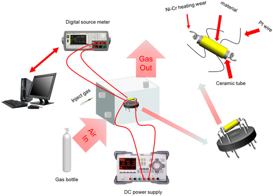 The schematic diagram of the test system is exhibited in Figure 2 [22,23]. The experimental platform was mainly composed of seven parts: a programmable DC power supply DP832A (manufactured by RIGOL Technologies, Beijing, China), a precision digital source unit B2902A (manufactured by KEYSIGHT Technologies,Santa Rosa, CA, USA), a computer, an enclosed gas cylinder (1 L), an air bottle, a thermocouple, and several types of sample gases. The sensors in this paper were all side-heat sensors composed of one ceramic tube, two parallel Au electrodes, a Ni-Cr alloy heater wire, four Pt wires, a rubber base, and coated nanometer materials. Both ends of the Ni-Cr resistance wire were connected to the DP832A to control the operating temperature of the sensor by controlling the power. Four Pt wires were connected to the B2902A to accurately test the changing resistance of the nanomaterials.