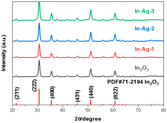 XRD patterns of the In2O3, In-Ag-1, In-Ag-2, and In-Ag-3.