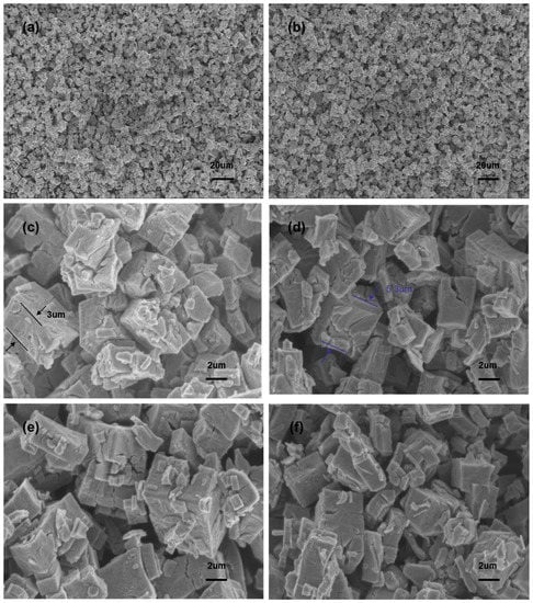 The morphologies of the In2O3, In-Ag-1, In-Ag-2, and In-Ag-3 materials are illustrated through SEM at different magnifications in Figure 4. The cube-like constructions of the four materials can be clearly seen, but the decorated Ag nanoparticles cannot be obviously observed in Figure 4c–f because of their tiny size. Due to the effect of the surfactant PEG 12000, the nanocubes with a thickness range from 3 μm to 5.3 μm were evenly distributed. The increasing amount of the Ag element had a slight impact on the microstructure. However, the saturation and shortage of the noble metal decoration led to a poor gas response.