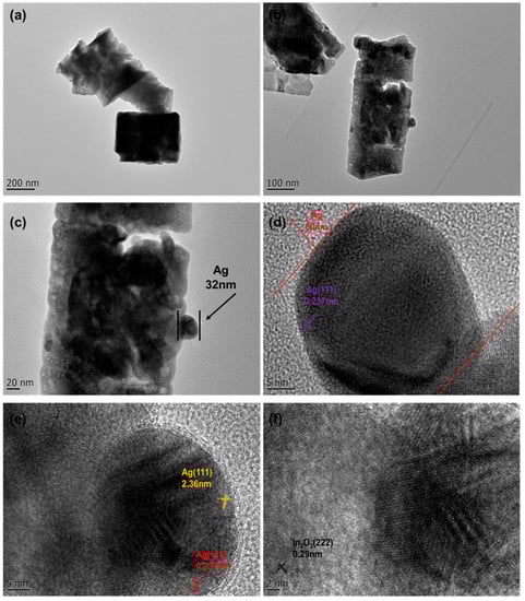 TEM and HRTEM were used to obtain further evidence of the successful decoration and information on the lattice stripe spacing [24]. Figure 6 shows to the TEM and HRTEM images of In-Ag-2 at different magnifications. Among them, Figure 6a–c are TEM images with different magnifications, showing the cubic microstructure of In2O3. In addition, in Figure 6c, it can be observed that Ag nanoparticles with a particle size of about 30 nm adhered to the In2O3 nanocube without changing the morphology and structure of the initial materials. Figure 6d–f show the HRTEM images. The lattice stripe spacings in Figure 6d,e are 0.236 nm and 0.237 nm, which are consistent with the (111) crystal plane of Ag, and in Figure 6f, the lattice stripe spacing is 0.29 nm, which is consistent with the (222) crystal plane of In2O3.