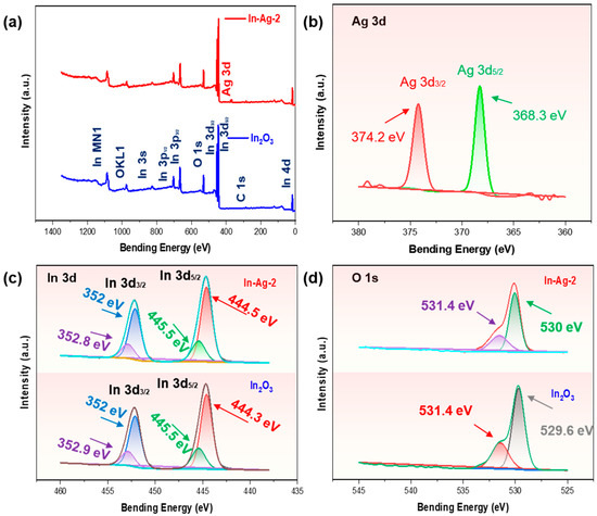 (a) XPS survey spectra of In-Ag-2 and In2O3; high-resolution elemental spectra of (b) Ag 3d, (c) In 3d, and (d) O 1s in In-Ag-2 and pristine In2O3.