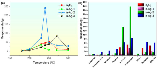 (a) Sensitivity of gas sensors based on the In2O3, In-Ag-1, In-Ag-2, and In-Ag-3 to 100 ppm of 2-butanone gas from 180 °C to 300 °C; (b) selectivity of the In2O3, In-Ag-1, In-Ag-2, and In-Ag-3 gas sensors.