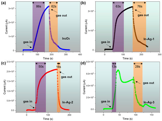 Response/recovery time of (a) In2O3, (b) In-Ag-1, (c) In-Ag-2, and (d) In-Ag-3 sensors to 100 ppm of 2-butanone at operating temperatures.