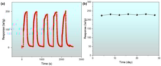 (a) Repeatability test of the In-Ag-2 sensor to 100 ppm of 2-butanone at 240 °C; (b) the long-term stability curve of the In-Ag-2 sensor.