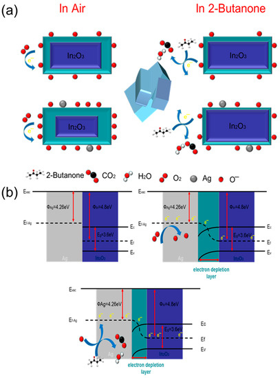 (a) The gas adsorption sensing mechanism diagram and (b) the energy band graph of the Ag-decorated In2O3 gas sensor.