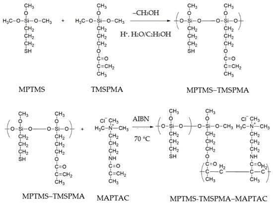 Tetraethoxysilane (TEOS, 99%, Sigma-Aldrich, St. Louis, MO, USA), (3-mercaptopropyl)trimethoxysilane (MPTMS, 95%, Sigma-Aldrich, St. Louis, MO, USA), 3-(trimethoxysilyl)propyl methacrylate (TMSPMA, 98%, Sigma-Aldrich, St. Louis, MO, USA), [3(methacryloylamino)propyl] trimethyl ammonium chloride (MAPTAC, 50%, Sigma-Aldrich, St. Louis, MO, USA), ethanol (95%, Sigma-Aldrich, St. Louis, MO, USA), hydrochloric acid (0.1 mol/L, Sigma-Aldrich), sodium citrate (99%, Sigma-Aldrich, St. Louis, MO, USA) and hydrogen tetrachloroaurate(III) hydrate (HAuCl4·xH2O, 99.9%, Sigma-Aldrich, St. Louis, MO, USA) were purchased. All the used deionized water (DIW) was prepared using a Milli-Q Millipore (Bedford, MA, USA) purification system.