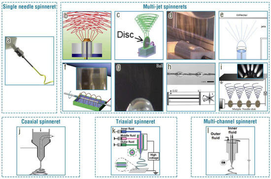 The spinneret is a critical component of electrospinning, as it determines the resulting microarchitectures of the prepared materials to a large extent. Various spinnerets possess their own characteristics for electrospinning. Five types of common spinnerets, including (i) single-needle spinneret, (ii) multi-jet spinneret with various mechanical and array structures, (iii) coaxial spinneret, (iv) triaxial spinneret, and (v) multi-channel spinneret, are systematically described. The single-needle spinneret usually has a blunt tip (Figure 2a) which is used typically to produce randomly oriented fibers [62], aligned fibers [69], and various self-assembled electrospun microstructures [1,2,3,4,5,6,37]. The alignment and diameter of the prepared fibers can be well controlled by adjusting the electrospinning parameters, such as the electrostatic field strength and solution flow rate [70]. In contrast to the single-needle spinneret that commonly emits a single jet from the Taylor cone, the multi-jet spinneret is used to emit multiple jets, leading to a more uniform distribution of electrospun fibers and higher production rates. Multi-jet spinnerets include needleless spinnerets and multiple-needle spinnerets. Needleless spinnerets have all types of sharps, for example pyramid- (Figure 2b) [71], disk- (Figure 2c) [50], cylinder- (Figure 2d) [72], tube- (Figure 2e) [73], spiral- (Figure 2f) [74], ball- (Figure 2g) [75], and wire-shaped [76](Figure 2h) spinnerets. The multiple-needle spinneret consists of two or more needles arranged in various ways (Figure 2i) [77,78]. Due to the complex structure of spinnerets and mutual interference of multiple jets, the diameter and alignment of the fibers prepared by means of multi-jet spinnerets may not be as controllable as with a single-needle spinneret [79]. The coaxial spinneret can produce core–shell [80], hollow [81], and porous [82] fibers with controlled diameters and shell thicknesses. In this type of spinneret, the polymer solution or oil is dispensed through an inner needle, while a sheath fluid is dispensed through an outer needle (Figure 2j) [80,81,82]. Similarly, the triaxial spinneret with three concentrically arranged spinnerets can produce fibers with core–shell–shell [83] and wire-in-tube [84] structures. The innermost spinneret is used to dispense a core solution, which is surrounded by a middle spinneret that dispenses a shell solution or oil and then a third outermost spinneret that dispenses (another) shell solution (Figure 2k) [83,84]. Moreover, the multi-channel spinneret is capable of fabricating fibers with multi-channel microtube and multicomponent microcapsule structures (Figure 2l) [85].