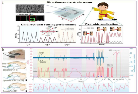 According to working mechanisms, current electrospun pressure sensors can be divided into capacitive, piezoresistive, piezoelectric, triboelectric, and iontronic pressure sensors [7,150,151]. Electrospun 1D fibrous, 2D interconnected network, and 2D aligned fiber structures are able to improve the stress distribution and enhance the stretchability of piezoelectric and piezoelectric strain sensors [104,152]. For example, Huang et al. prepared a 1D serpentine self-similar electrospun PVDF piezoelectric fiber array—which, serving as a piezoelectric velocity, strain, and pressure sensor—possessed a high stretchability of more than 300% [153]. This piezoelectric sensor was able to monitor posture and movement of the human body for healthcare. The network and porous structures in the interiors of 2D and 3D electrospun mats could provide good compressibility and associated electrostatic effect, which were beneficial for enhancing the capacitance, resistance, and voltage changes of capacitive, piezoresistive, and triboelectric pressure sensors under a certain pressure [154,155]. For example, Zhang et al. fabricated a triboelectric action sensor consisting of electrospun nanoporous fibers, which delivered ultrahigh electrical outputs of 56.9 W m−2 and 2209 V under an impact force of 100 N. Owing to its excellent electrical performances and, therefore, high signal-to-noise ratio, the triboelectric sensor was able to detect various body motions, such as running, walking, and picking up an object [37]. Some 3D (secondary) microstructures or 3D gradient microarrays on the electrospun mat surface were able to improve the effective contact area, stress distribution, and compressibility of triboelectric, iontronic, piezoresistive, piezoelectric, and capacitive pressure sensors at a certain pressure [1,135,156]. The 3D spiral structure of the electrospun yarn enhanced the stretchability and strength of the piezoresistive strain sensors [130]. These inherent structural advantages of electrospun fibers and fabrics optimize multiple sensing properties, especially sensitivity and detection limit, of corresponding wearable sensors and, therefore, promote their application in health, action, and manipulation monitoring [7]. Additionally, optimizing electrospun fiber density and alignment can further endow these wearable devices with new functions and better usage experience. For example, Yang et al. used a pair of 2D uniaxially aligned antimony-doped tin oxide electrospun nanofiber films to assemble a wearable strain sensor with direction-awareness and high transparency (Figure 8a) [157]. The single electrospun film exhibited exceptional anisotropic sensing performance, allowing for unidirectional sensing capability along the nanofiber direction. This sensing property was leveraged to construct the direction-aware biaxial strain sensor by stacking these two electrospun films orthogonally. Meanwhile, they demonstrated the potential of this direction-aware strain sensor for multi-degree-of-freedom applications, such as human motion monitoring and human–machine interaction. In addition, Zhang et al. used ultrathin, ultralight, gas-permeable 3D EMPA films to design a capacitive–triboelectric hybrid sensor with high sensitivity of 19 kPa−1, ultralow detection limit of 0.05 Pa, ultrafast response less than 0.8 ms, and good imperceptibility (Figure 6z) [1]. This on-skin sensor could detect an ultraweak fingertip pulse during monitoring of natural finger manipulation over a wide frequency range with minimal sensory interference, which was suitable for recording complicated manipulation details and detecting mental stress and emotion information of the eSports players (Figure 8b).