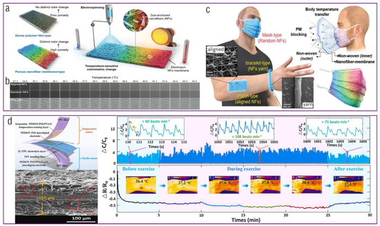 Temperature is a fundamental physical indicator that reflects the human physiological, psychological, and health status. The human body temperature is approximately 36–37 °C, and the pleasant ambient temperature is usually between 18 and 24 °C. Deviations from this range, whether too high or too low, can cause certain harm to human health. In addition, the ambient temperature can also affect people’s comfort levels. Wearable electrospun temperature sensors can be divided mainly into thermochromic and resistive temperature sensors [158,159,160,161]. Thermochromic sensors render an effective and intuitive real-time solution to detect the local temperature by the naked eye. In general, electrospun thermochromic temperature sensors are prepared by adding colorimetric dyes to the liquid precursor with a subsequent electrospinning process. Compared with traditional dense film-based thermochromic sensors exposing many dye molecules to the surface, the porous electrospun nanofiber structure with uniformly distributed dyes possesses superior light transmittance and, therefore, higher sensitivity and faster response speed. Kim et al. prepared an electrospun thermochromic sensor using (C3H6N6·CH2O)x as thermochromic dyes, which had high sensitivity and fast response time at 31.6–42.7 °C (Figure 9a). They found that the aligned electrospun nanofiber-based sensor showed 1.67-fold enhancement in thermochromic sensing performances compared with a randomly oriented fiber sensor (Figure 9b). Moreover, the electrospun thermochromic fibers can be processed into 2D films and 3D yarns to monitor real-time body temperature in the forms of patches, masks, and bracelets (Figure 9c) [158].