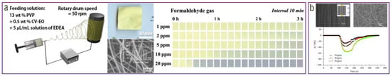 Applications of electrospun textiles in wearable gas sensing. (a) Schematic diagram, SEM image, and sensing performances of the electrospun chemical dye gas sensor consisting of stacked nanofibers. (Reprinted with permission from Ref. [13]. Copyright 2022, Wiley-VCH.) (b) SEM images and sensing performances of an electrospun resistive CO sensor. (Reprinted with permission from Ref. [33]. Open access Creative Common CC licensed 4.0, Hindawi).