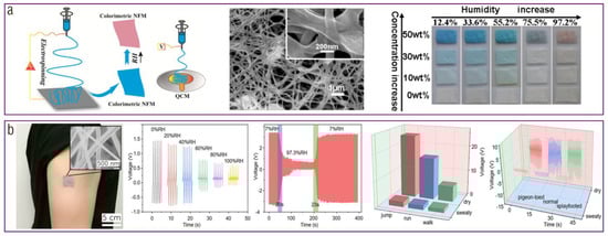 Applications of electrospun textiles in wearable humidity sensing. (a) Schematic diagram, SEM image, and sensing performances of the electrospun colorimetric humidity sensor. (Reprinted with permission from Ref. [169]. Open access Creative Common CC licensed 4.0, Springer Nature.) (b) Photograph, SEM image, and sensing performances of the electrospun sensing–transducing-coupled piezoelectric humidity sensor. (Reprinted with permission from Ref. [170]. Copyright 2023, Royal Society of Chemistry).