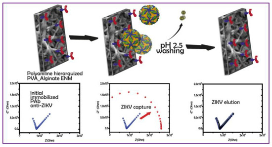 The biomolecules in the human body reflect the state of physical health, and detecting these molecules can provide valuable insights into the body’s condition. This is particularly important for preventing the spread of infectious diseases and early treatment of major chronic illnesses. It should be noted that human biomolecules may contain various components, such as bacteria and viruses, and effective methods are needed to detect them [171]. Electrospun polymeric nanofiber membranes can be easily modified and functionalized with more target binding sites and sensing elements to improve their sensitivity and selectivity for biomolecule analytes [172]. For example, Frias et al. produced an asymmetrical nanofiber-based mat with an open-porous characteristic by the electrospinning of PVA and alginated polymers and posterior hierarchization with conductive polyaniline, which was used to detect the Zika virus (Figure 12) [173].