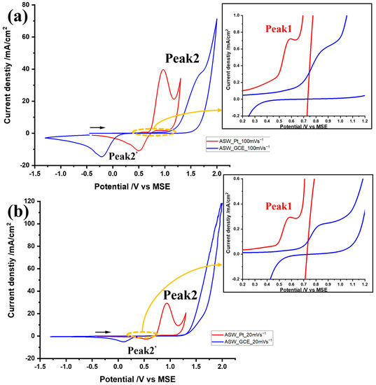 Cyclic voltammograms using a Pt electrode (red) and GCE (blue) in degassed ASW with different scan rates of (a) 100 mVs−1 and (b) 20 mVs−1. Insert: expanded bromide oxidation peaks. The start potential was −0.45 V vs. MSE.