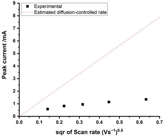 The plot of the peak current against the square root of the scan rate. Experimental data: black squares. Estimated diffusion-controlled rate (red dotted line).