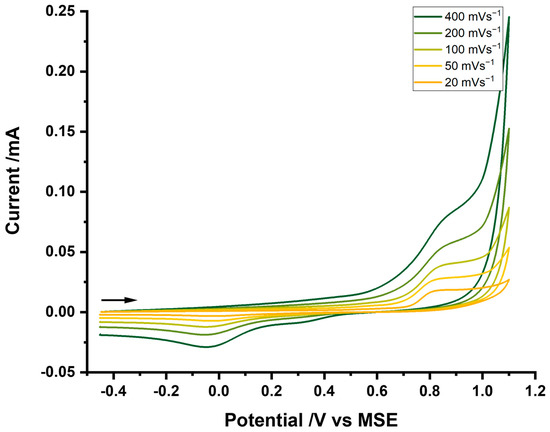 In this section, a GCE is briefly assessed for the oxidation of bromide ions in ASW from an analytical perspective. The study was carried out via cyclic voltammetry with different scan rates of 20, 50, 100, 200 and 400 mVs−1, where the sweep of potential started at −0.45 V vs. MSE, and then, swept towards 1.1 V before returning to −0.45 V. The voltammograms are shown in Figure 4, where the two features identified above were again observed, namely, bromide oxidation and the corresponding reduction. Although these increased with increasing scan rate, the oxidation of bromide cannot be distinguished from the oxidation peak of chloride, which is also found to interfere with the oxygen evolution reaction (OER). In addition to the proximity to chloride oxidation and the OER, the presence of a pre-wave (see later) also prevented quantitative Tafel analysis and the application of the Randles–Ševčík equation. Attempts were made to increase its resolution using square wave voltammetry but, as reported Supporting Information Section S3, these were unsuccessful. Our attention therefore returned to the cyclic voltammetric data and a standard addition approach was adopted [58].