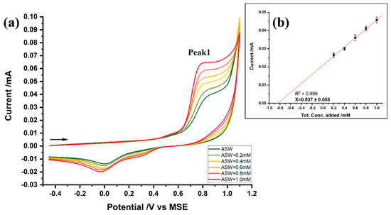 (a) Cyclic voltammograms recorded at the GCE in degassed ASW and with standard additions at a scan rate of 100 mV s−1. The start potential was −0.45 V vs. MSE. (b) Graphical analysis of standard additions.