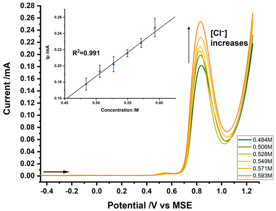 The dominant chloride oxidation peak was recorded at 0.83 V vs. MSE. To analyse the data, the oxidation peak currents of the chloride were measured. A plot of the peak current against the chloride concentration in the ASW samples is shown in the insert of Figure 6. The peak height increased linearly in the concentration range of chloride studied (from 0.484 M to 0.593 M). The best-fit line (R2 = 0.991) was determined as follows: