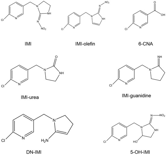When pesticides are applied to crops, they are often converted into metabolites. In the case of IMI, the degradation of IMI produces several metabolites, including imidacloprid-olefin (IMI-olefin), urea-imidacloprid (IMI-urea), 6-chloronicotinic acid (6-CNA, or 6-chl), 5-hydroxy-imidacloprid (5-OH-IMI), desnitro-imidacloprid (DN-IMI), and nitro-methylene analogue (CH-IMI) [25,26,27,28,29,30], etc. Their chemical structures are shown in Figure 1. The metabolites produced by IMI are related to the environment, and they exhibit higher toxicity than IMI. For example, in casing soil during mushroom cultivation, the main metabolites were IMI-urea, IMI-olefin, and 6-CNA [31]. In honey, the concentrations of IMI-olefin (5.6 ng g−1) and 5-OH-IMI (21.1 ng g−1) were higher than those of IMI (0.8 ng g−1) [32]. To make matters worse, the metabolites are more toxic than IMI itself. For example, IMI-olefin is twice as toxic as IMI [33]. Hence, the risk of IMI metabolites should be considered comprehensively when evaluating the harm of IMI.