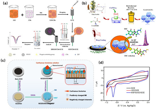 (a) Schematic procedure for the preparation of E-rGO/CDs/GCE. Reproduced from [64] with permission from Elsevier. (b) Schematic representation of the synthesis of Ce2S3/GACFs and its electrochemical detection of imidacloprid. Reproduced from [22] with permission from ACS. (c) Representation of the preparation of MSF/ErGO/GCE and its electrochemical detection of imidacloprid, and (d) CVs of diffident electrodes in 0.1 M HAc-NaAc buffer (pH 5.0) containing 20 μg mL−1 IMI. Reproduced from [65] with permission from Elsevier.