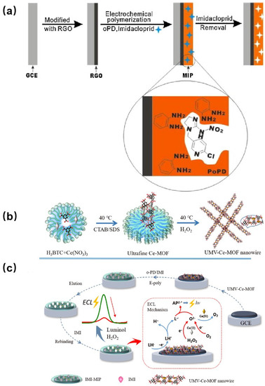 Molecularly imprinted polymers (MIPs) are tailor-made synthetic materials with high-affinity binding sites for a specific target molecule [73]. MIPs are prepared by mixing a target molecule as a template with a cross-linking agent and an initiator. After polymerization, the template is removed, leaving the hole exactly the same as the target molecule. The forming hole can rebind perfectly with the target molecule, allowing it to be specifically recognized and detected target molecule. Therefore, sensors based on MIPs have been designed and applied in various fields, such as environmental analysis [74], pharmaceutical analysis [75], nucleic acid assay [76], and food safety [77]. For instance, the Zhou group [78] prepared MIP on graphene oxide modified GCE by cyclic voltammetry, using IMI as the template and o-phenylenediamine (o-PD) as the functional monomer (Figure 4a). The imprinted electrode exhibited good selectivity toward IMI, detecting IMI in the concentration range of 0.75–70 μM with a LOD of 0.4 μM. The Wang group [79] synthesized MIP by chemical method, using p-vinylbenzoic acid (VBA) as functional monomer, IMI as template molecule, ethylene glycol dimethacrylate (EGDMA), and azobisisobutyronitrile (AIBN) as cross-linker and initiator. The prepared MIP was dropped on polished GCE and applied for IMI detection. This proposed sensor could detect IMI at 0.5–15 μM with a LOD of 0.1 μM. Moreover, it was successfully applied to detect IMI in brown rice samples. Tang et al. [80] prepared upconverting nanoparticles with a modified zeolite imidazolate framework and MIPs composite (MIPs/UCNPs@ZIF-8) for constructing an electrochemiluminescence (ECL) sensor. The obtained ECL sensor exhibited excellent performance for IMI detection in a concentration range of 0.1 ng L−1 to 1 mg L−1 with a LOD of 0.01 ng L−1. Ma et al. [81] developed an ECL sensor for trace detection of IMI based on an ultrafine mixed-valence Ce-MOF (UMV-Ce-MOF) combined with MIP (Figure 4b,c). This proposed sensor could detect IMI with high sensitivity and selectivity.