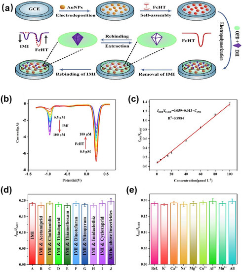 (a) Schematic diagram of the fabrication process of the MIP/FcHT/AuNPs electrode. The performance of the proposed sensor: (b) DPV responses and (c) calibration curve of the MIP/FcHT/AuNPs electrode in PBS after incubation with different concentrations of IMI. Selectivity of the MIP/FcHT/AuNPs electrode in the presence of (d) IMI analogs or (e) metal ions. Reproduced from [89] with permission from Elsevier.