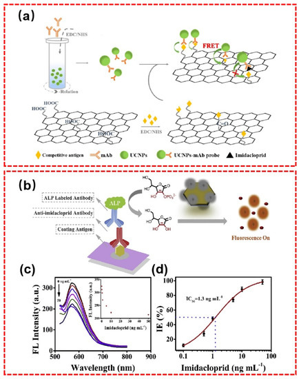(a) Schematic of the FRET immunoassay between UCNPs and GO for one-step detection of imidacloprid residue. Reproduced from [12] with permission from Elsevier. (b) Schematic representation of FIA. (c) The FL spectra of the FIA toward imidacloprid standards with various concentrations (0, 0.1, 0.5, 1.0, 5.0, 10, and 50 ng mL−1). (d) The linear plot of IE (%) versus the concentration of imidacloprid. Reproduced from [91] with permission from Elsevier.